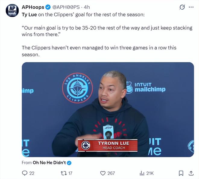 在湖人VS快船的赛前,泰伦卢在采访中说道:我已经告知全队,我们接下来的目标是55场比赛里赢下其中35场(35胜20负),我们会没事的。(35胜20负,也就是接下来的胜率为63.6%,这个胜率实际上是西部前六的水准)